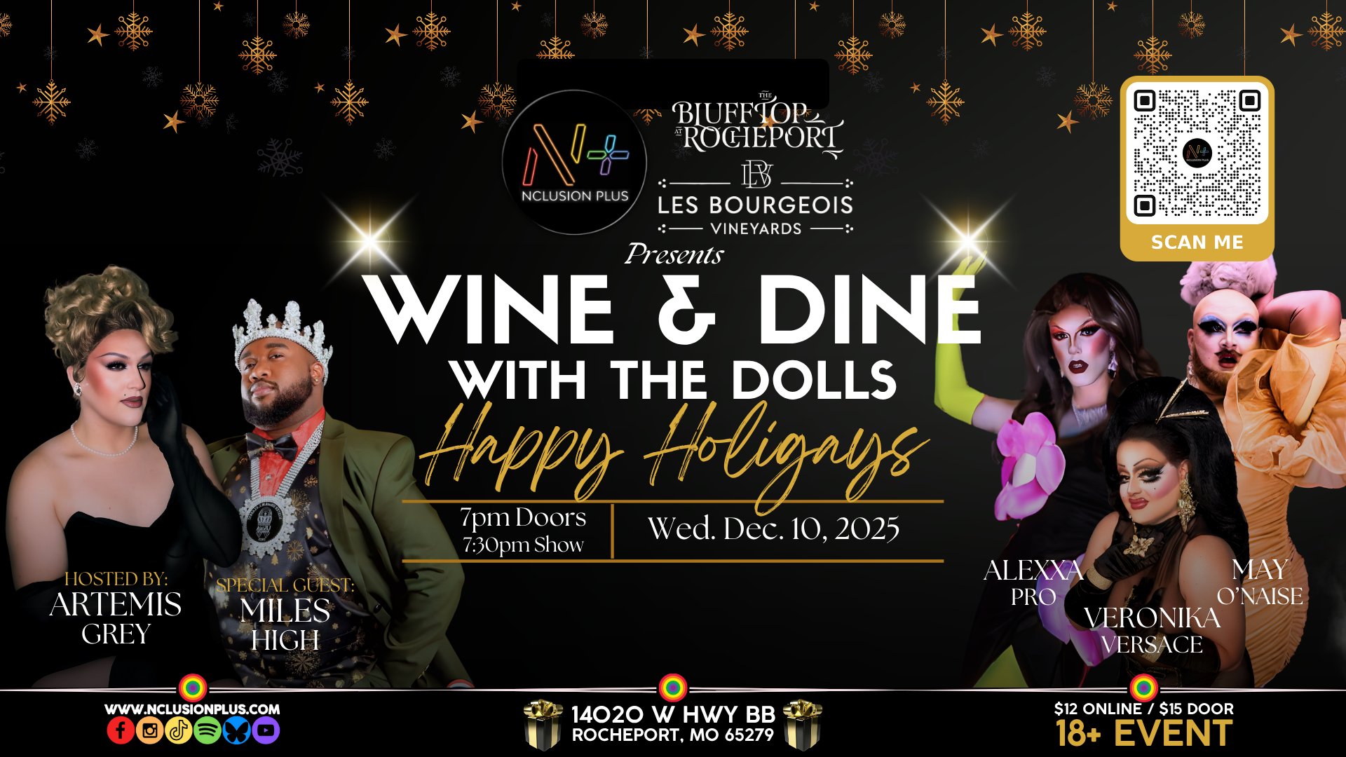 Celebrate the season with sparkle, sass, and a side of glamour at the HoliGay Edition of Wine & Dine with the Dolls! Join us for an enchanting evening featuring exquisite food, festive drinks, and dazzling drag performances—all set against the stunning backdrop of the Blufftop Bistro.