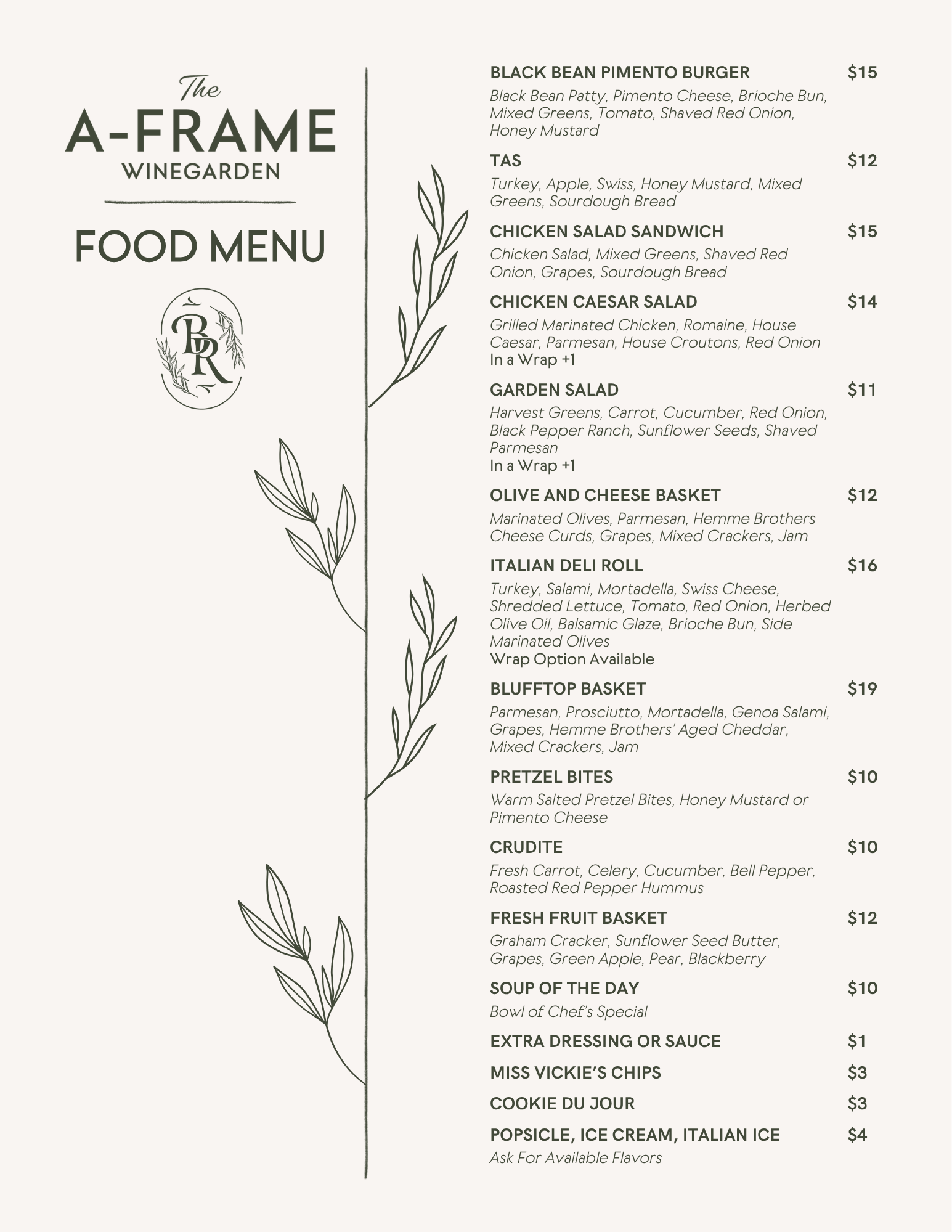 There are two covered areas to enjoy as open seating when available, or you can book them for your next celebration. Whatever special event you may be hosting, The A-Frame is a great location for gathering with your favorite people. From baby showers, to birthdays, and everything in between, there’s no better backdrop than the view from the blufftop. Catering is available for events booked at The A-Frame.